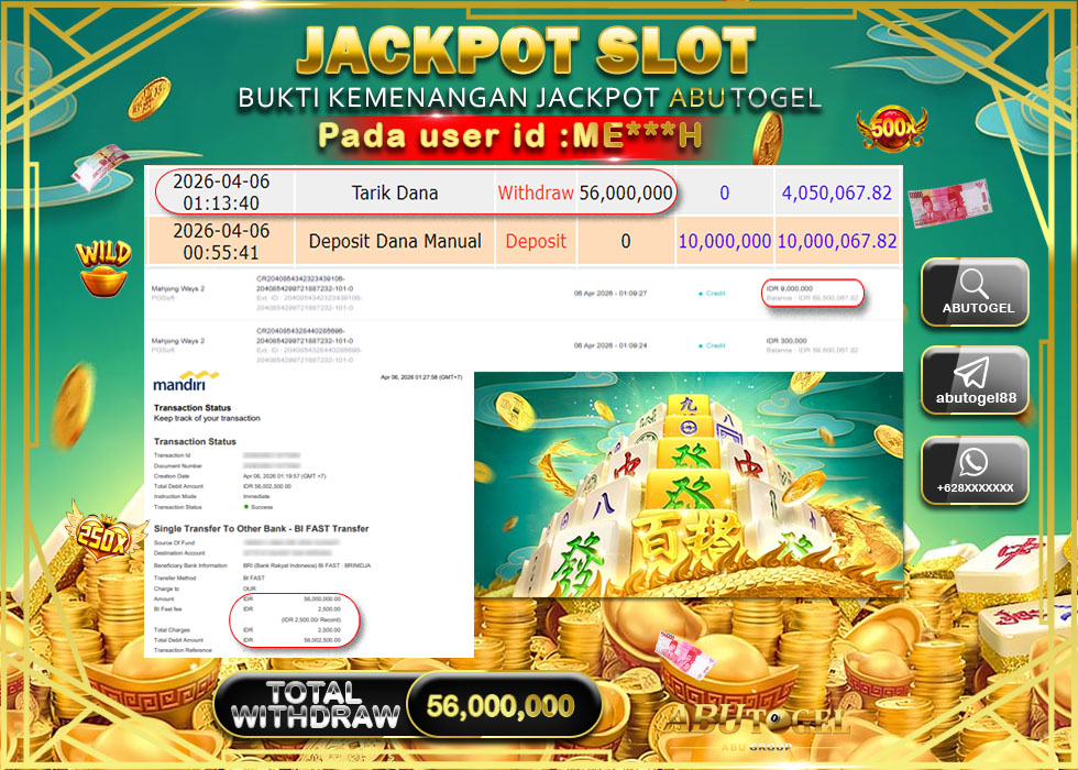 Bukti Jackpot Slot Online ABUTOGEL Senin, 06 April 2026 Rp 56,000,000 - LUNAS
