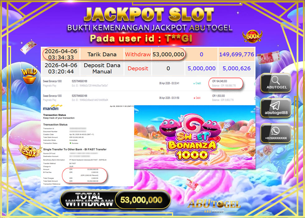 Bukti Jackpot Slot Online ABUTOGEL Senin, 06 April 2026 Rp 53,000,000 - LUNAS