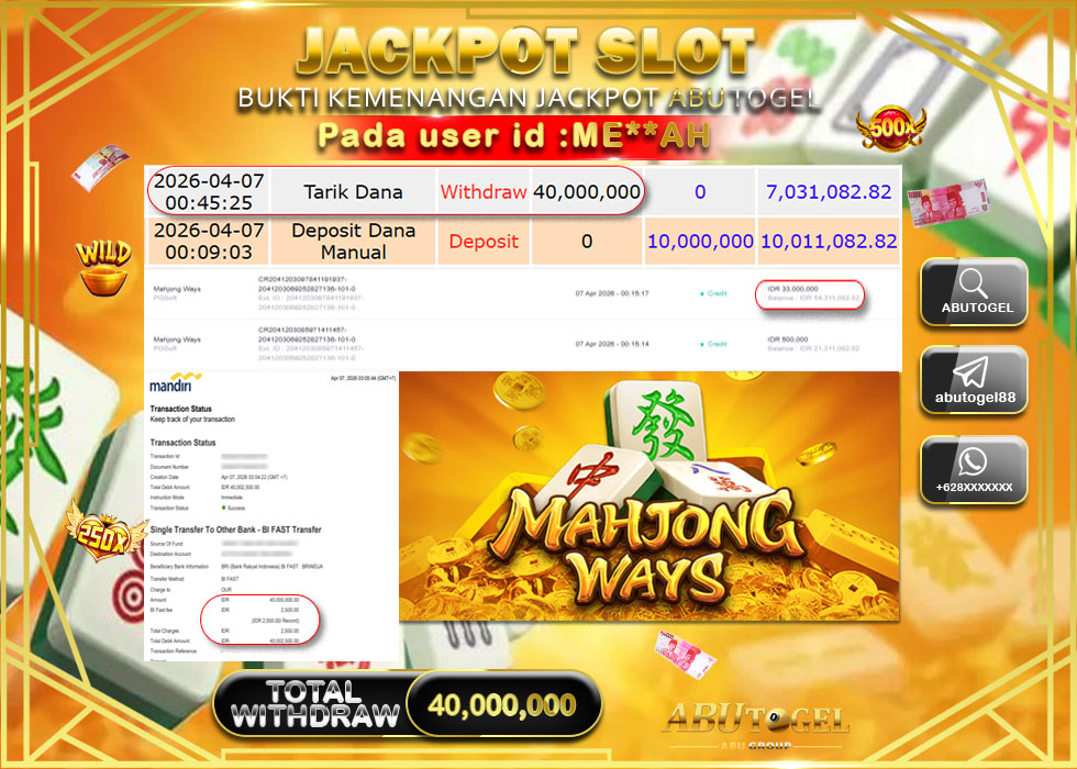Bukti Jackpot Slot Online ABUTOGEL Selasa, 07 April 2026 Rp 40,000,000 - LUNAS