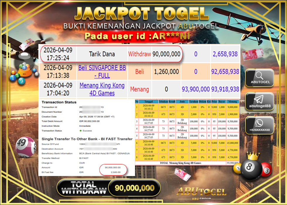 Bukti Jackpot Togel Online ABUTOGEL Kamis, 09 April 2026 Rp 90,000,000 - LUNAS