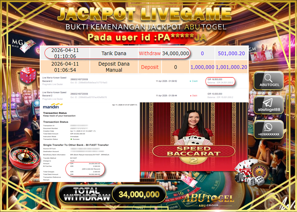 Bukti Jackpot Live Casino Online ABUTOGEL Sabtu, 11 April 2026 – ABUTOGEL adalah bo online terpercaya. Berikut ini kami berikan info bukti jackpot member ABUTOGEL yang sudah kami bayar lunas dalam permainan live casino online.