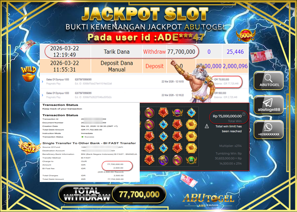 Bukti Jackpot Slot Online ABUTOGEL Minggu, 22 Maret 2026 Rp 77,725,446 - LUNAS