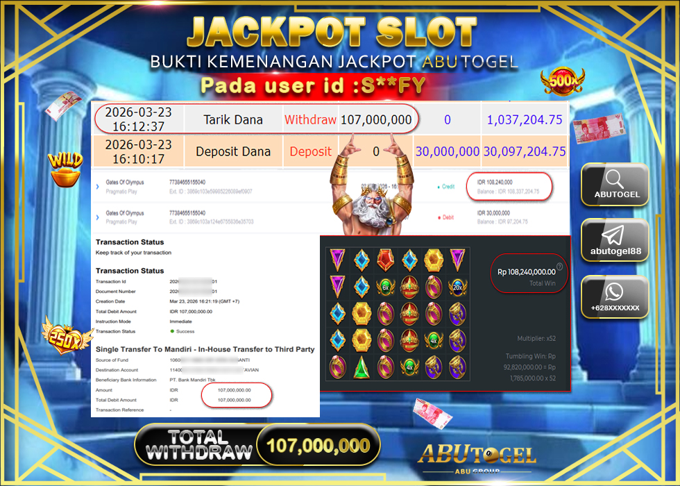 Bukti Jackpot Slot Online ABUTOGEL Senin, 23 Maret 2026 Rp. 107,000,000 - LUNAS