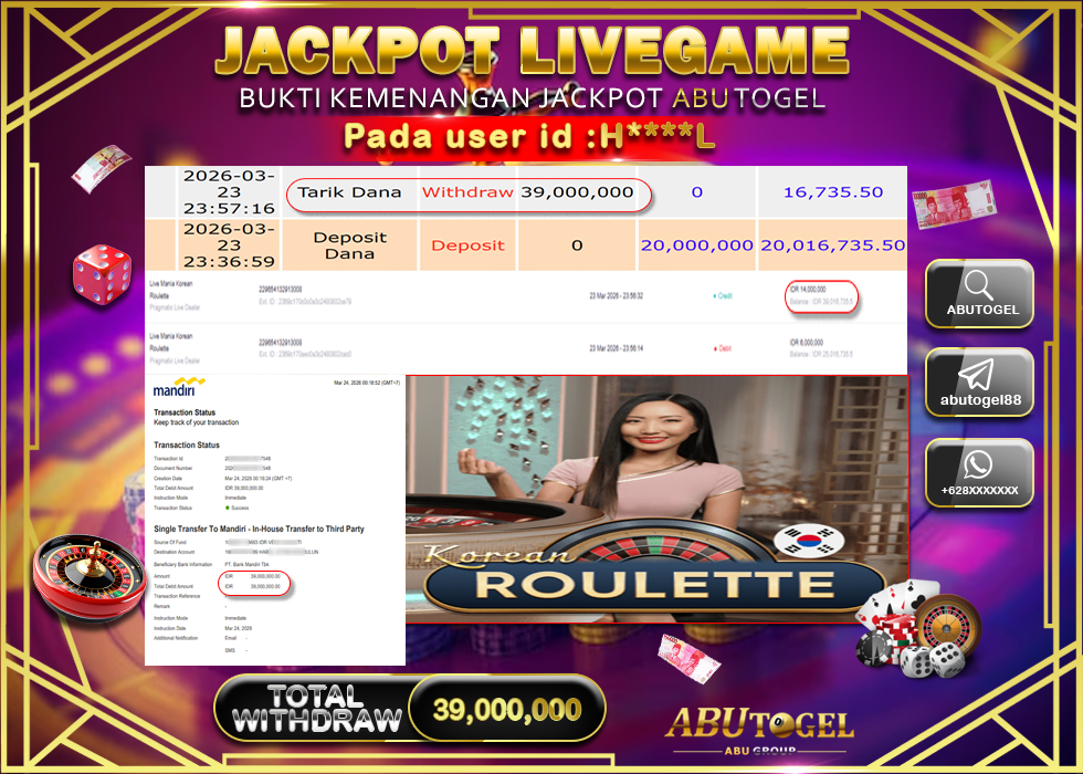 Bukti Jackpot Live Casino Online ABUTOGEL Selasa, 24 Maret 2026 RP. 39,000,000 - LUNAS