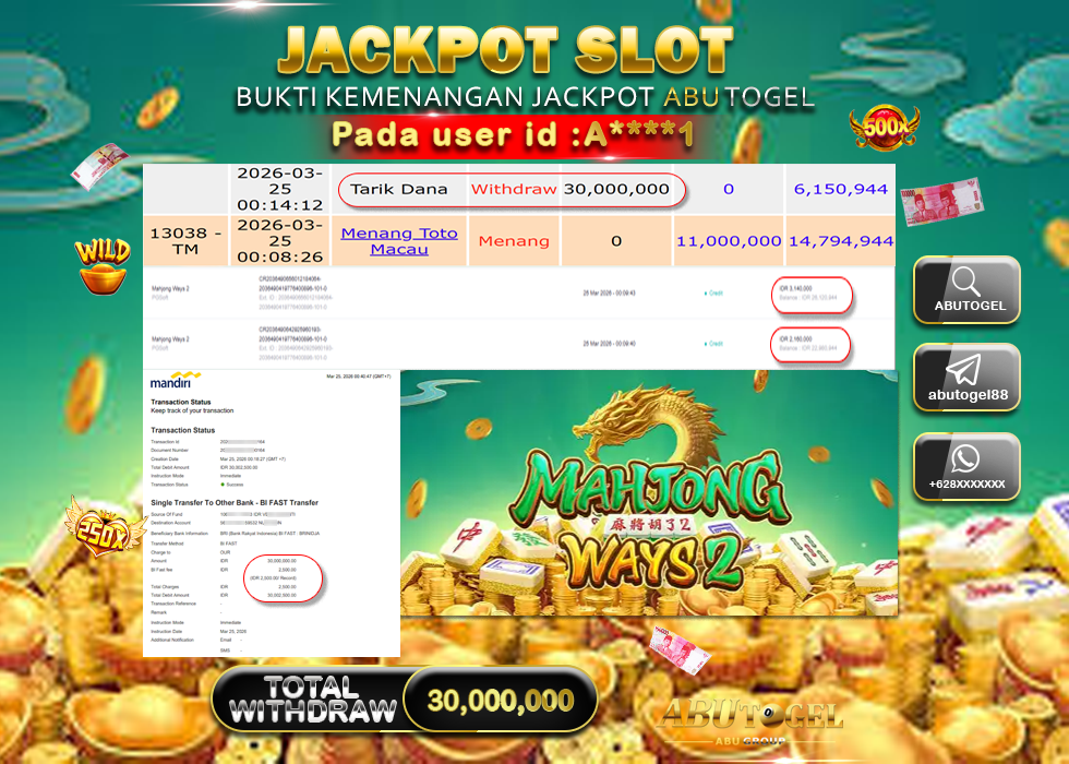 Bukti Jackpot Slot Online ABUTOGEL Rabu, 25 Maret 2026 RP. 30,000,000 - LUNAS